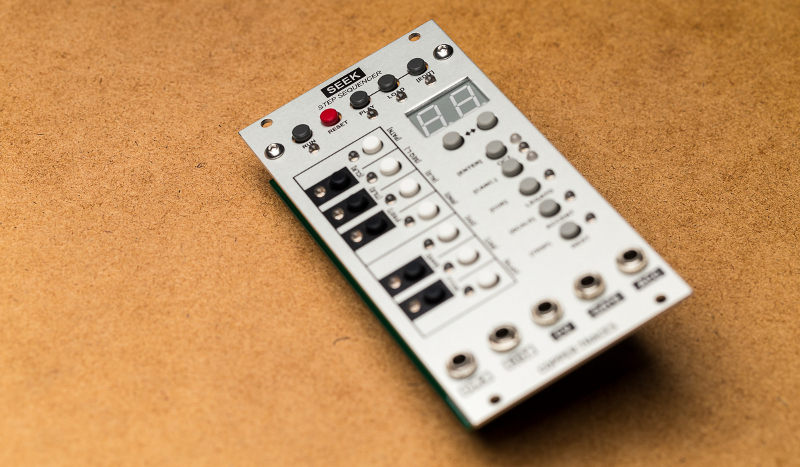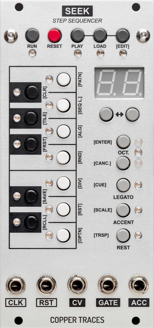 SEEK is a 64 step CV/gate sequencer with legato and an accent output. The easy to use yet compact interface allows for quick sequencing of complex, carefully crafted melodies. The multipurpose reset input, multiple pattern options and algorithmically controlled randomness make it perfect for completely or partially generative patterns.